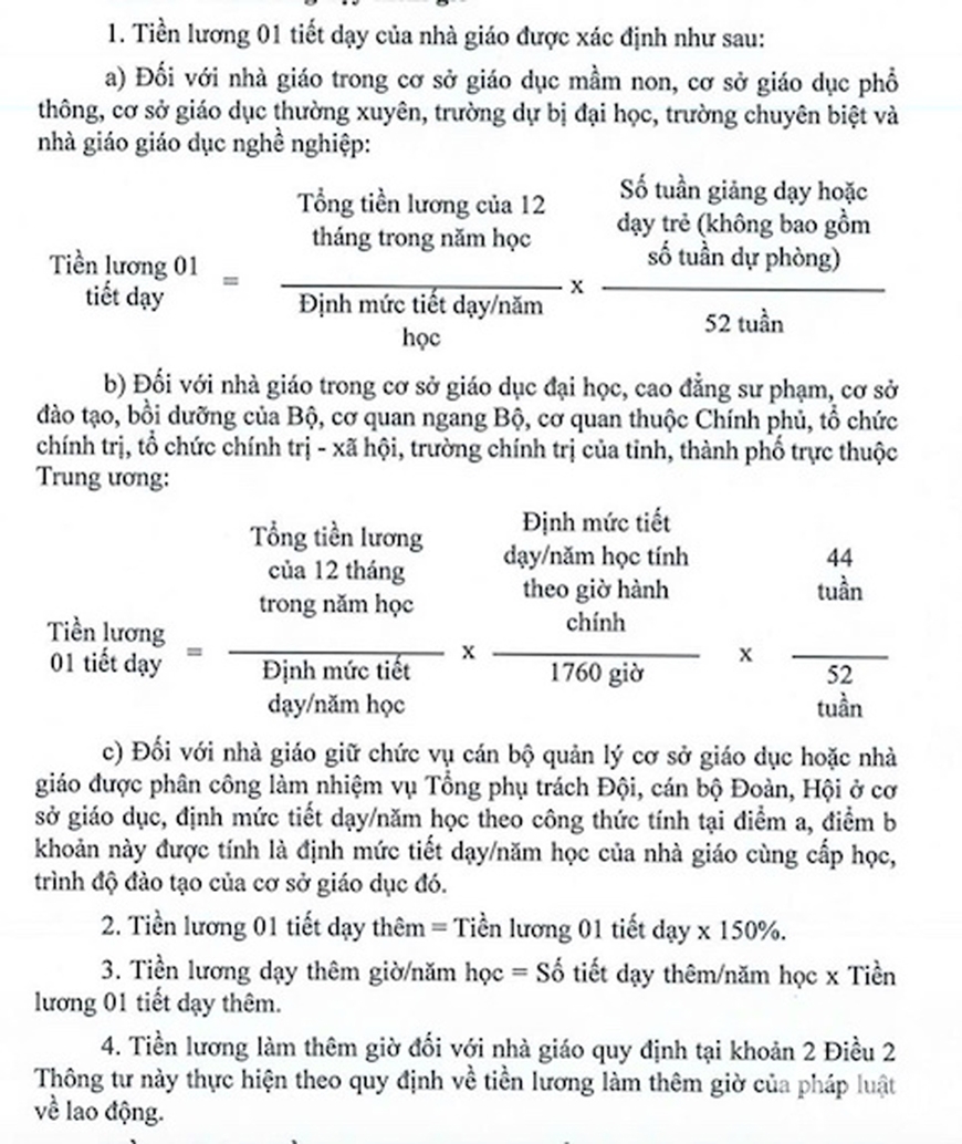 Đối với nhà giáo trong cơ sở giáo dục mầm non, cơ sở giáo dục phổ thông, cơ sở giáo dục thường xuyên, trường dự bị đại học, trường chuyên biệt và nhà giáo giáo dục nghề nghiệp, tiền lương dạy thêm giờ tính như sau: