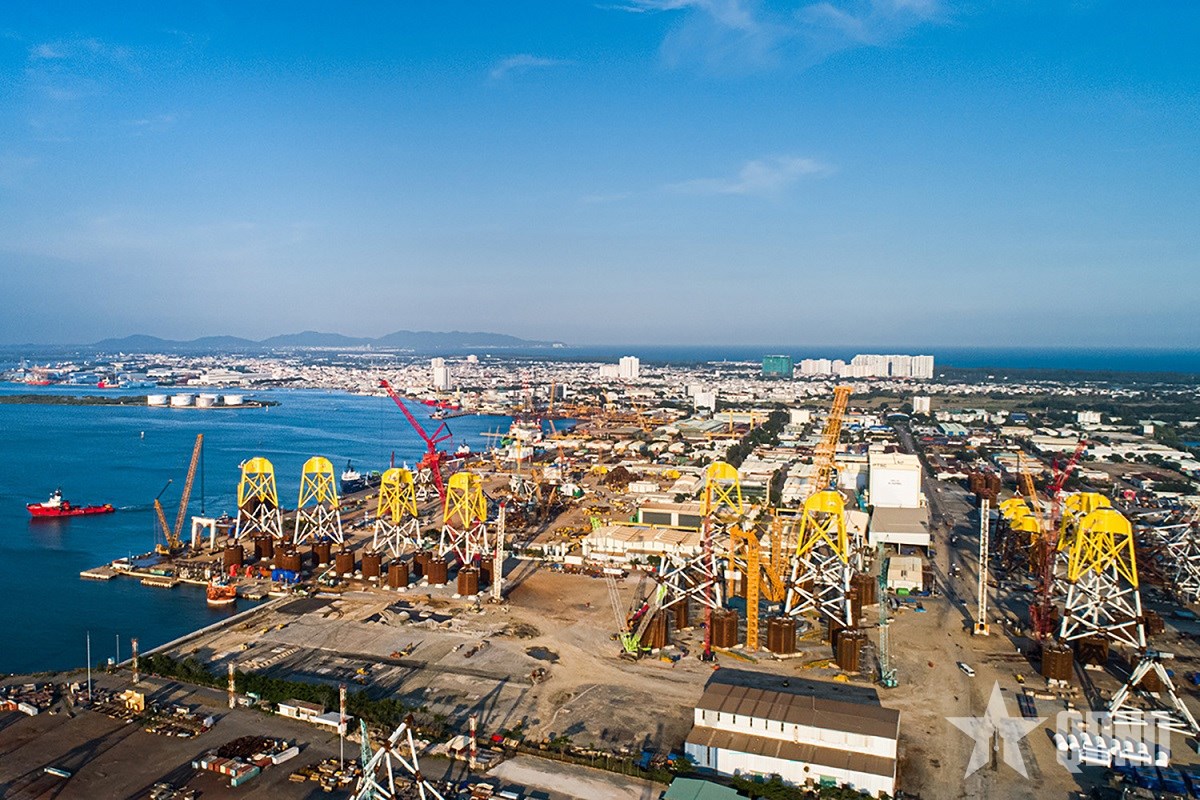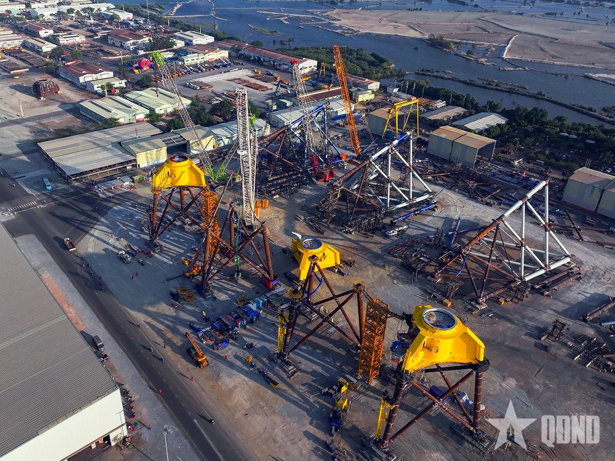 Thi công chân đế điện gió ngoài khơi tại trung tâm công nghiệp năng lượng và hậu cần kỹ thuật của Petrovietnam. Ảnh: AN SƠN |