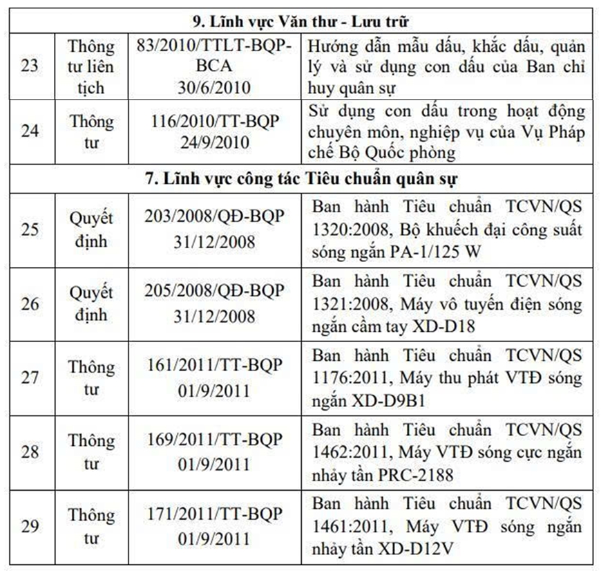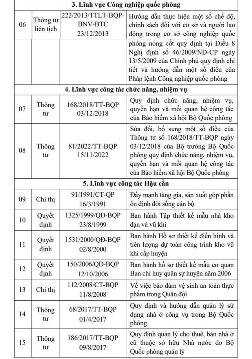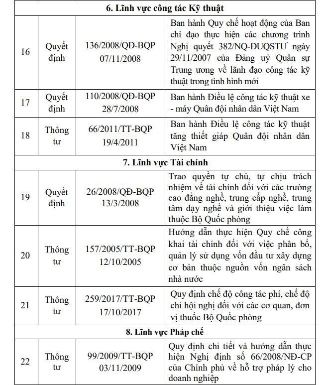 Danh sách các văn bản quy phạm pháp luật thuộc thẩm quyền ban hành của Bộ trưởng Bộ Quốc phòng được đề nghị bãi bỏ hoặc bãi bỏ một phần
