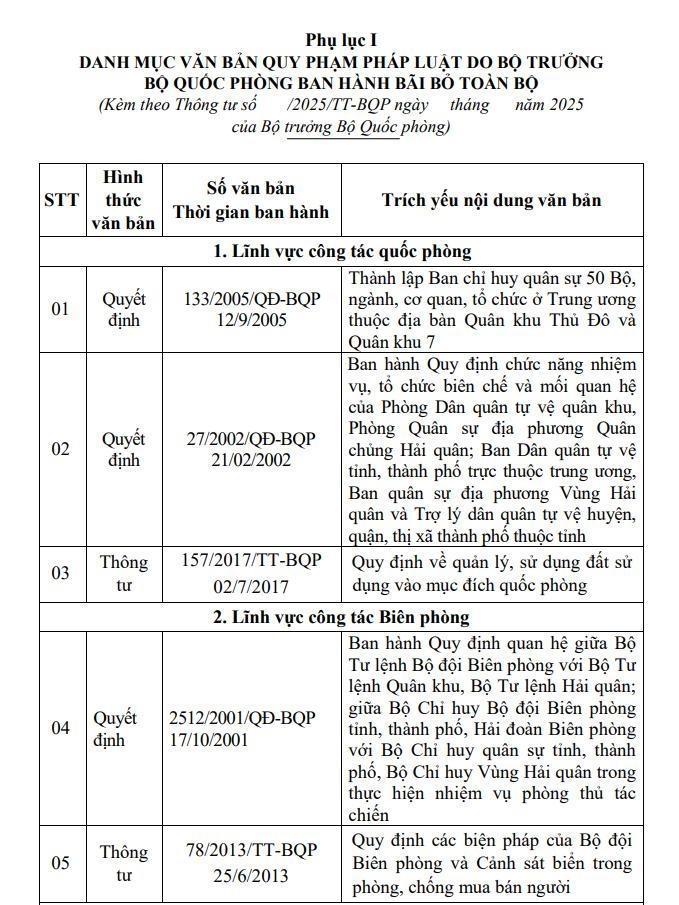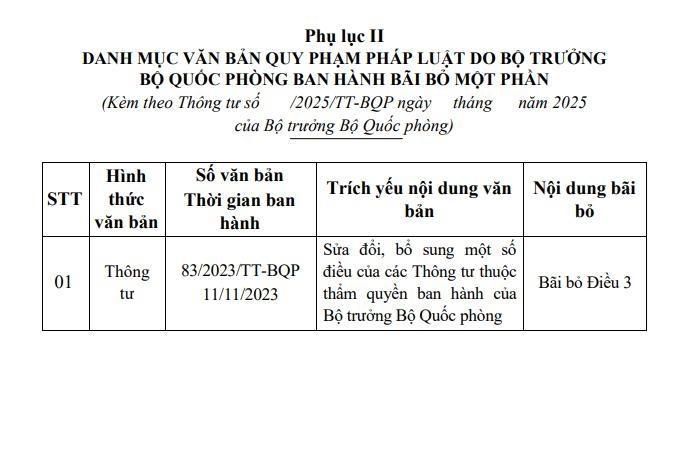 Cục Pháp chế, Bộ Quốc phòng chủ trì xây dựng dự thảo tờ trình, dự thảo thông tư bãi bỏ toàn bộ và một phần một số văn bản quy phạm pháp luật thuộc thẩm quyền ban hành của Bộ trưởng Bộ Quốc phòng và đang tổ chức lấy ý kiến để hoàn thiện.