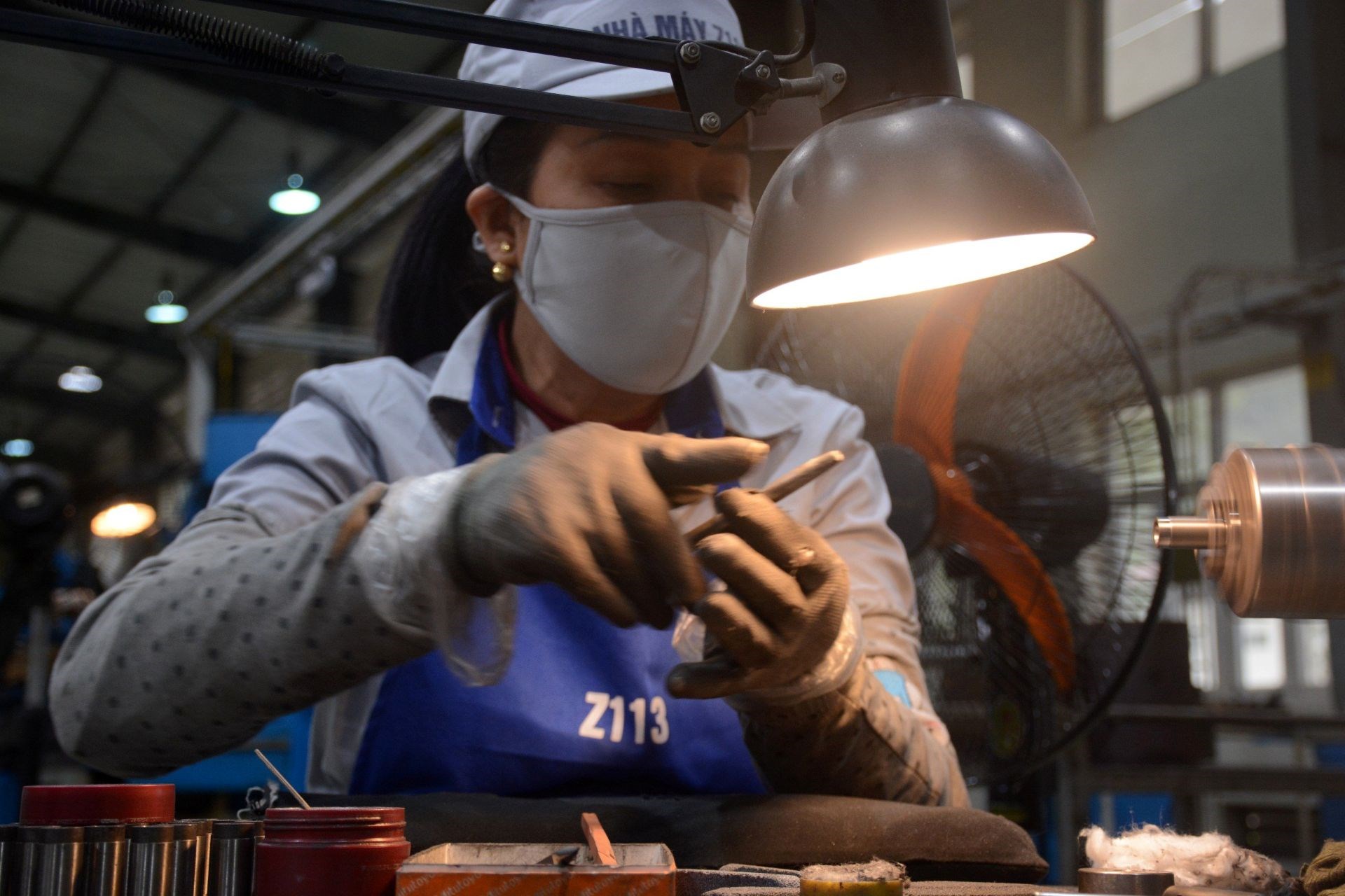 Công nhân làm việc tại Phân xưởng dụng cụ A2, Xí nghiệp 1, Nhà máy Z113 (Tổng cục Công nghiệp Quốc phòng). Ảnh: LINH AN |