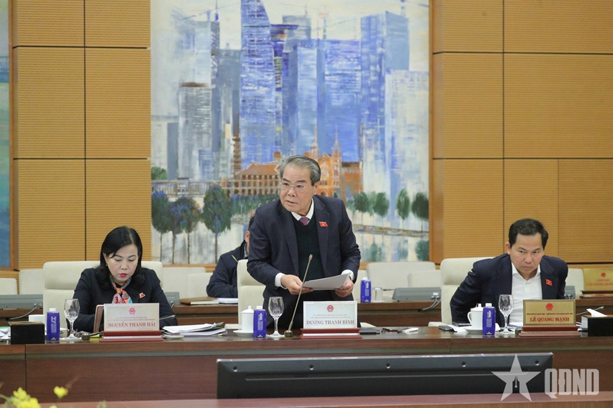 | Chủ nhiệm Ủy ban Dân nguyện và Giám sát của Quốc hội Dương Thanh Bình báo cáo tại phiên họp. |
