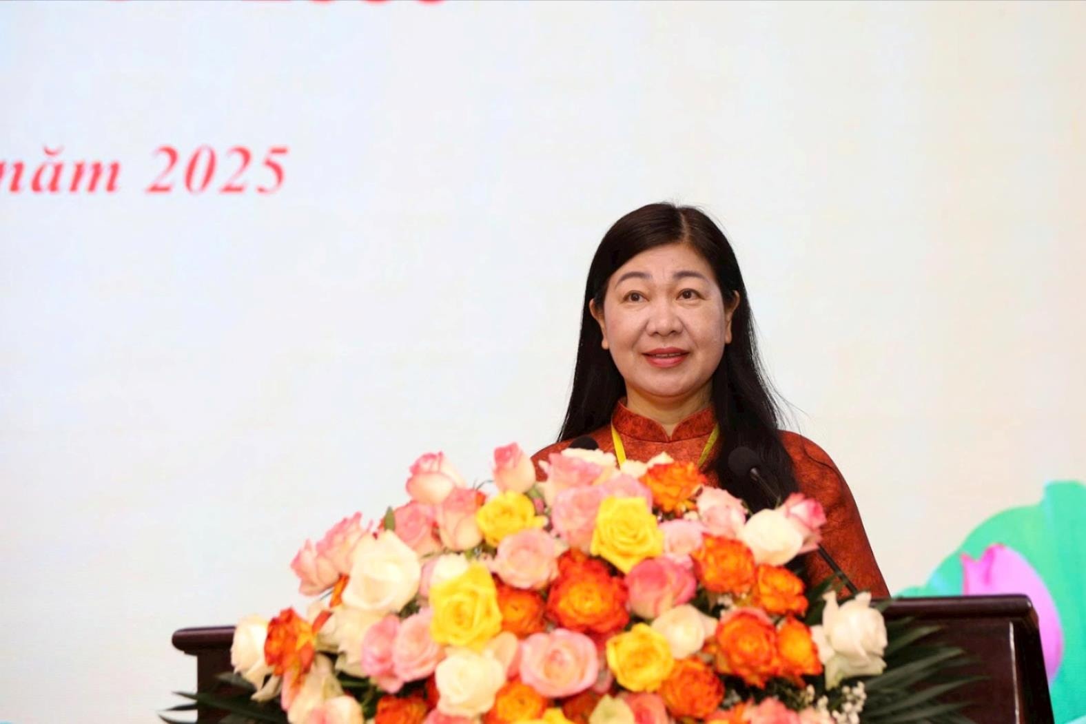 Chủ tịch Ủy ban MTTQ Việt Nam thành phố Hà Nội Nguyễn Lan Hương tặng hoa chúc mừng đại hội. Ảnh: Nguyên Anh