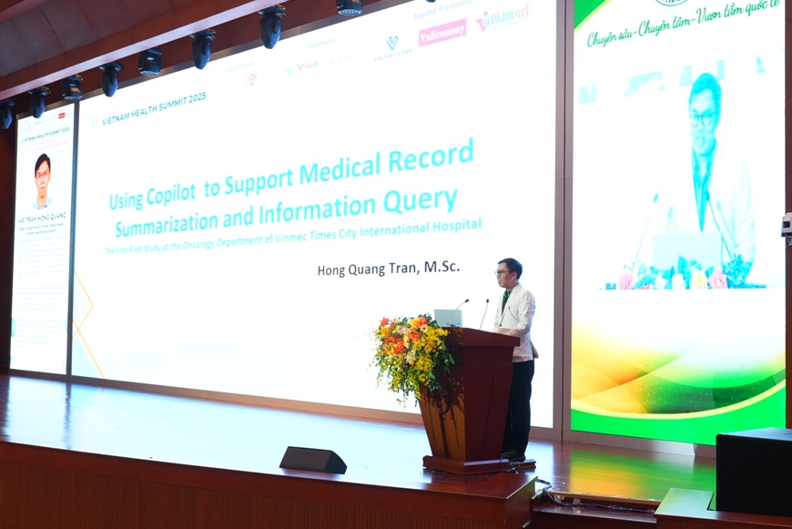 Ông Trần Hồng Quang – Trưởng phòng Sản phẩm Hệ thống, Hệ thống y tế vinmec báo cáo tại hội nghị. |