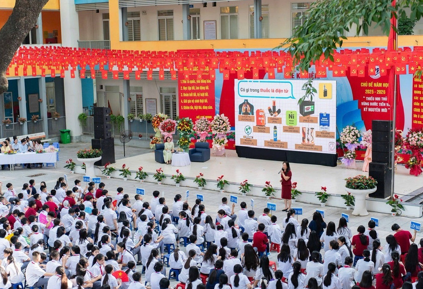 Một buổi chia sẻ về tác hại của thuốc lá điện tử và những nỗ lực để phòng chống trong học đường do Trường Đại học Y tế Công cộng phối hợp với Quỹ VinFuture tổ chức trong năm 2025. Ảnh: VFP.