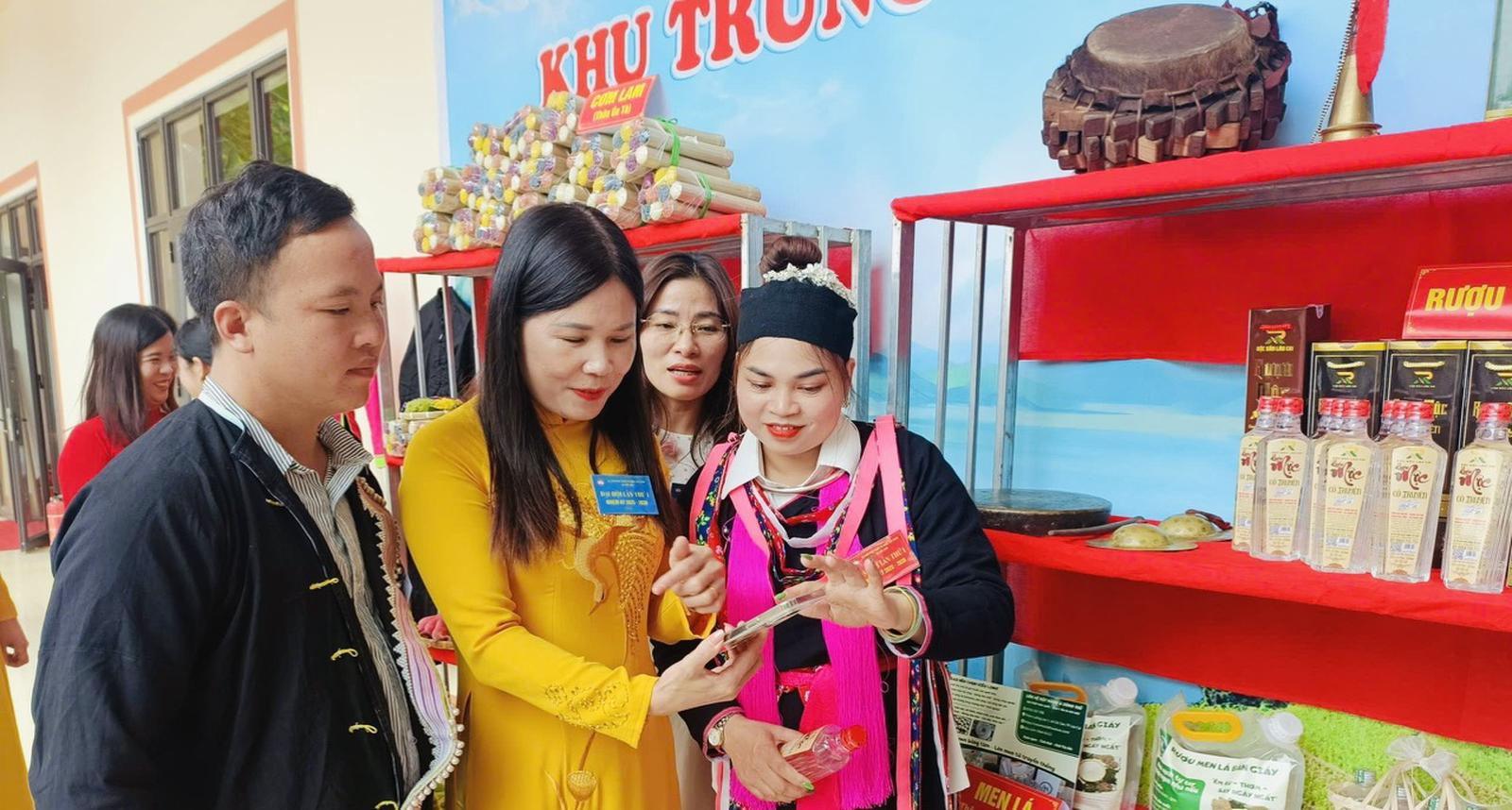 Bà Nguyễn Thị Bích Nhiệm, Phó Chủ tịch Ủy ban Mặt trận Tổ quốc Việt Nam tỉnh Lào Cai hướng dẫn người dân xã Cốc San mua hàng thanh toán bằng mã QR. Ảnh: MH