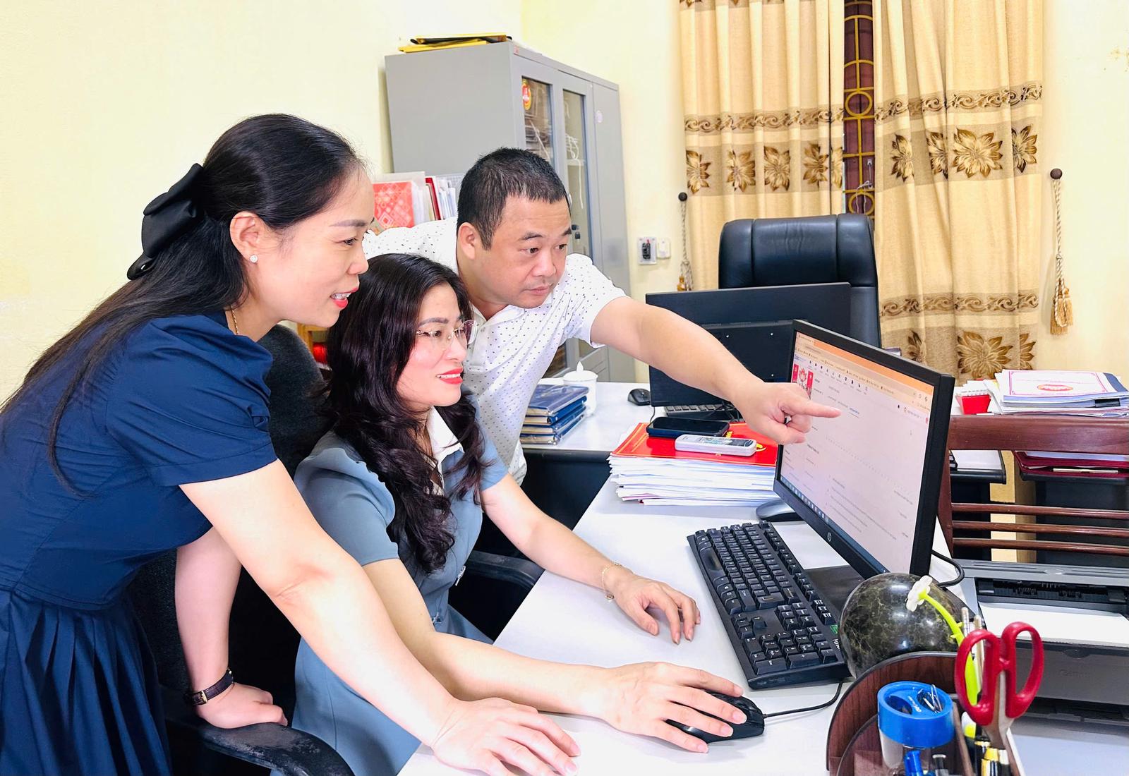 Tổ công nghệ số Cơ quan MTTQ Việt Nam tỉnh Lào Cai hướng dẫn cán bộ, công chức trong cơ quan sử dụng trang Zalo OA . Ảnh: Mai Hiên