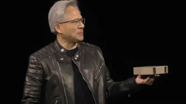 Ông Jensen Huang cầm máy tính DGX Spark AI tại bài phát biểu quan trọng của NVIDIA. (Ảnh: NVIDIA)