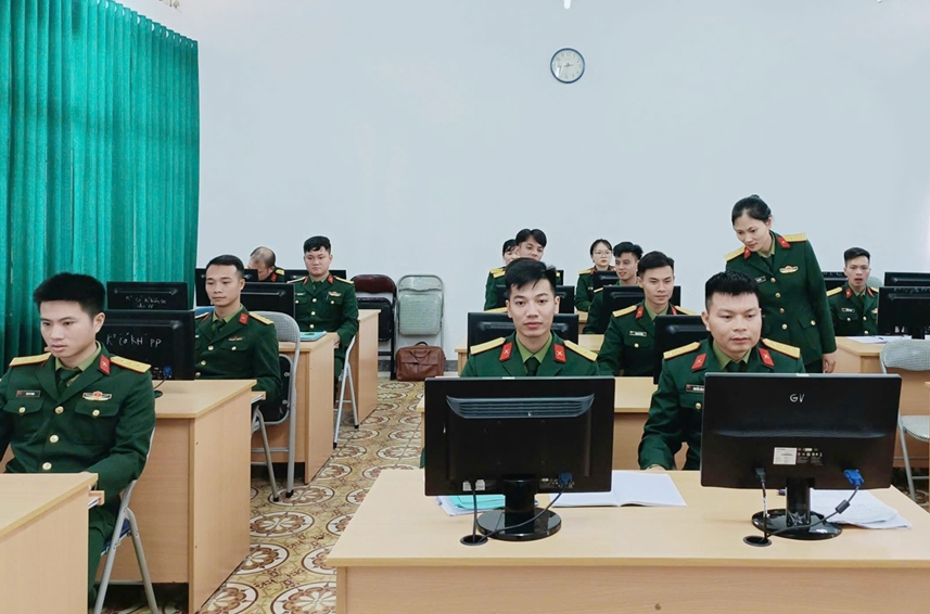 | Giảng viên Trường Sĩ quan Lục quân 1 hướng dẫn học viên lớp thạc sĩ quân sự thực hành trên máy tính tại phòng học. |