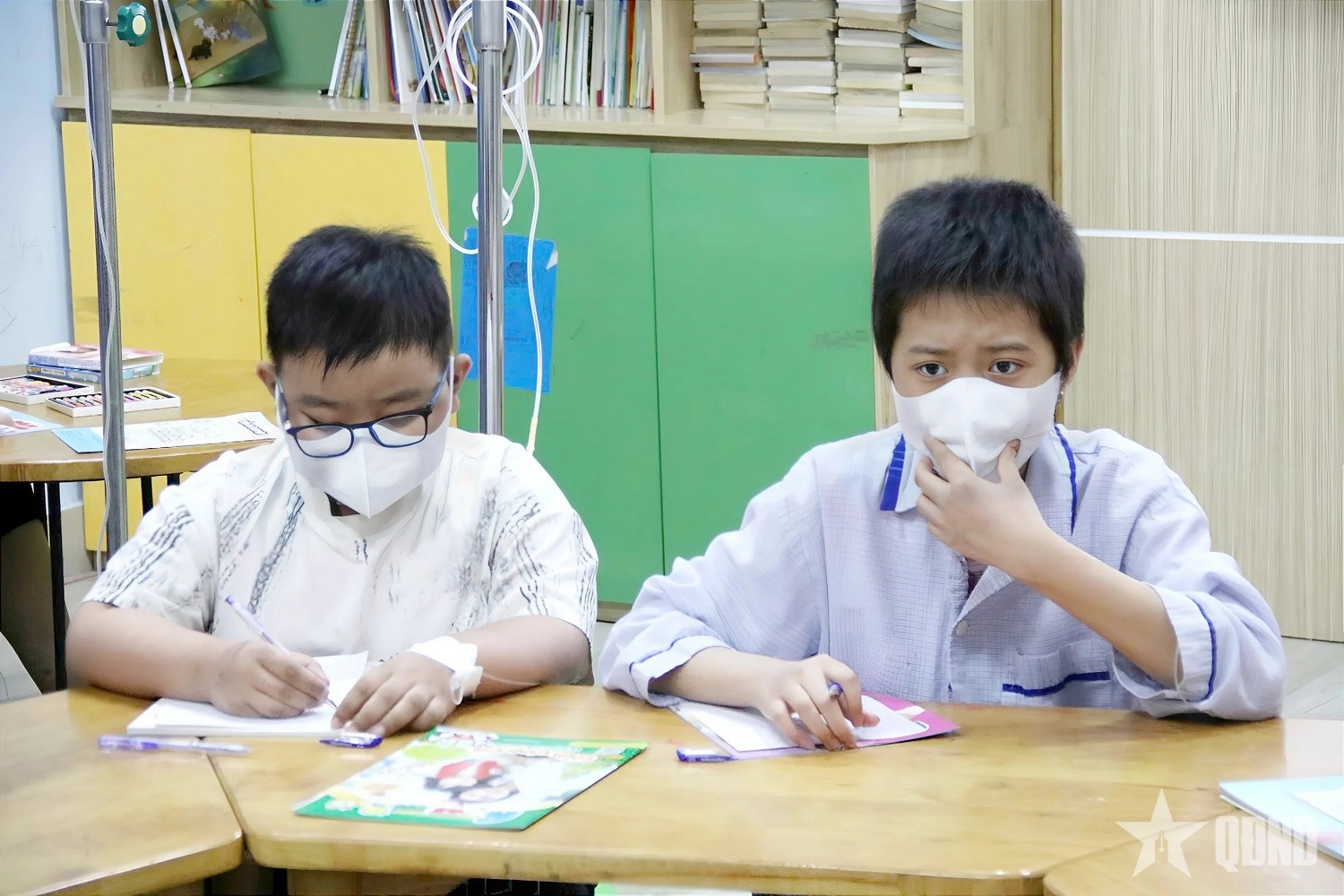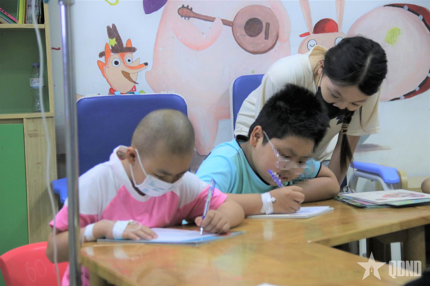 “Mẹ ơi, đến giờ rồi, mẹ đưa con sang lớp học với các bạn đi mẹ!” - tiếng gọi trong trẻo của N.G.H. (5 tuổi, quê Thái Bình) vang lên nơi hành lang bệnh viện. Cậu bé nhanh nhẹn cầm ghế, chỉnh lại quần áo, rồi kéo tay mẹ tới phòng thư viện của Khoa Bệnh máu trẻ em (Viện Huyết học-Truyền máu Trung ương). Sáng chủ nhật hằng tuần, căn phòng nhỏ trở nên đặc biệt với bệnh nhi ung thư bởi các em được học tập, vui chơi đúng với lứa tuổi của mình, tạm quên đi kim tiêm, hóa chất.