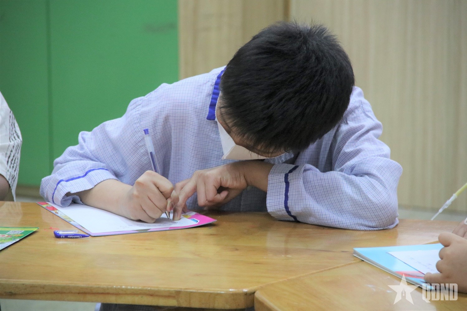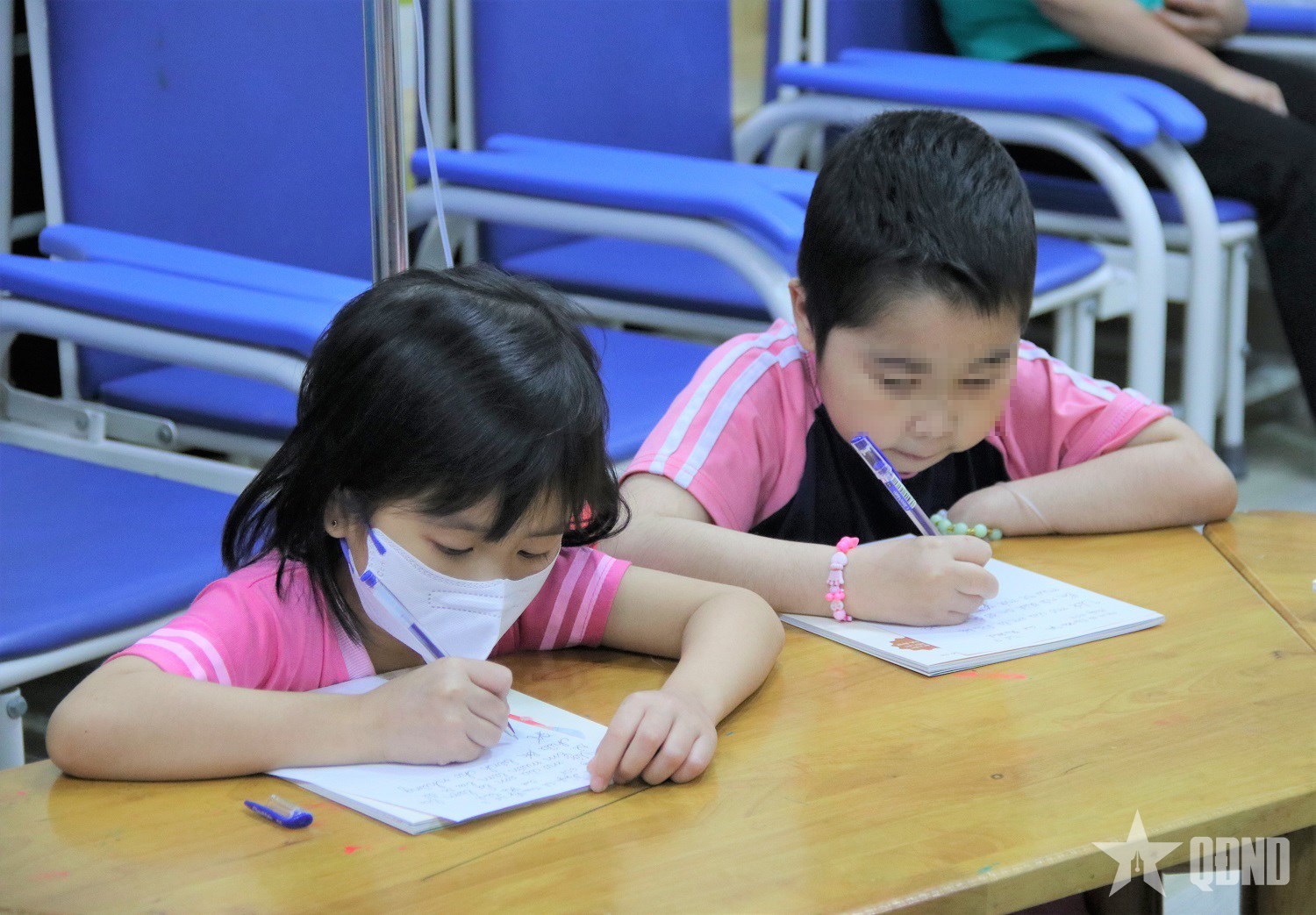 | Dù kim truyền còn ghim trên tay, các em nhỏ vẫn nắn nót từng chữ cho bài viết của mình bằng tất cả sự cố gắng. |