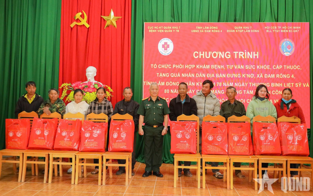 Đại diện Ban giám đốc Bệnh viện 7B tặng quà đến người dân hoàn cảnh khó khăn trong chương trình khám bệnh, cấp thuốc tại Lâm Đồng. Ảnh: HÀ NGỌC |