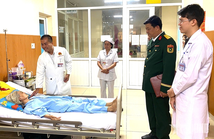 | Lãnh đạo Bệnh viện Quân y 120 thăm, tặng quà bệnh nhân đang điều trị tại bệnh viện. |