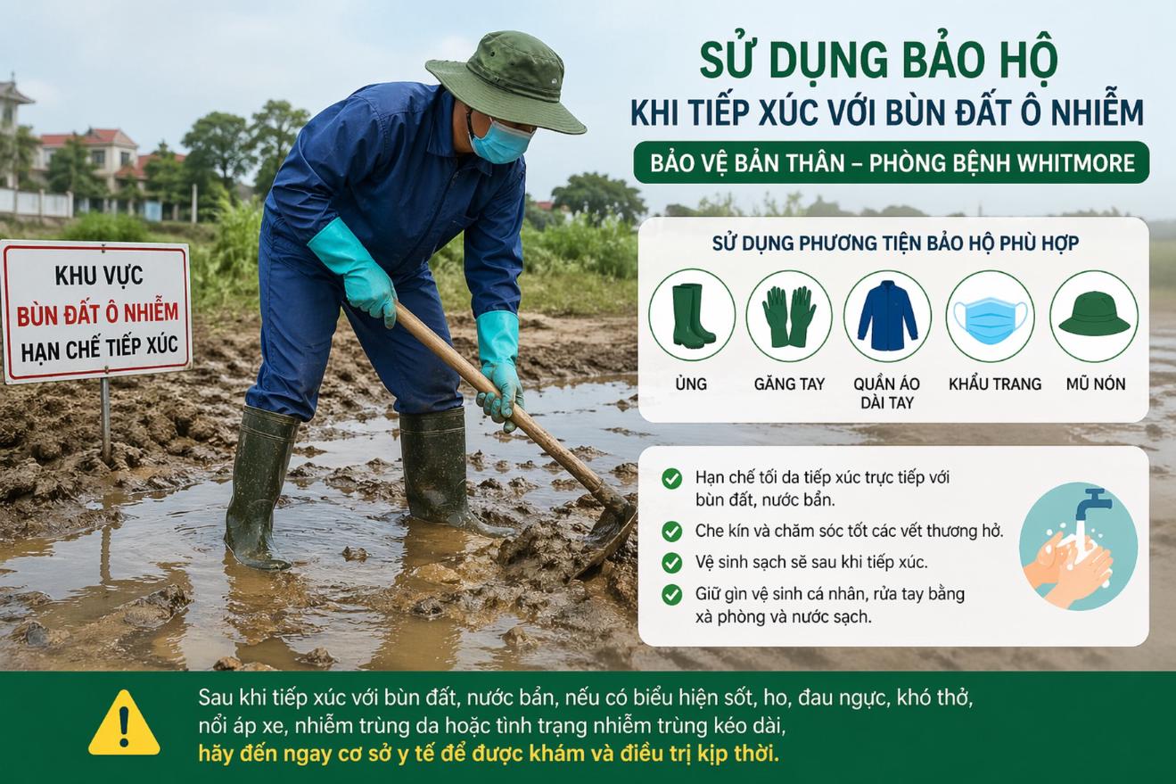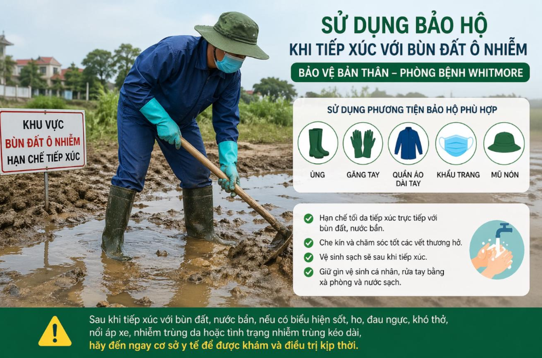 Sau khi tiếp xúc với đất, bùn, nước bẩn, nhất là sau mưa bão, ngập lụt, nếu có biểu hiện sốt, ho, đau ngực, khó thở, nổi áp xe, nhiễm trùng da hoặc tình trạng nhiễm trùng kéo dài, cần đến ngay cơ sở y tế để được khám, tư vấn, chẩn đoán và điều trị kịp thời.