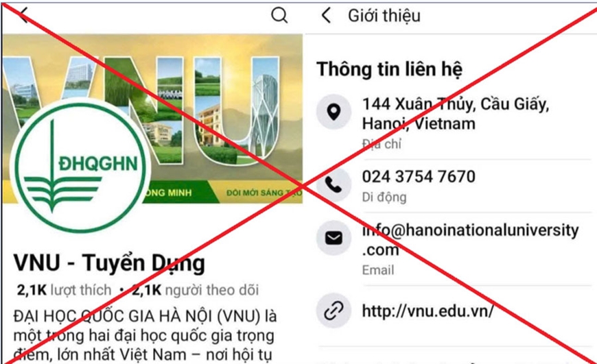 Vừa qua, Đại học Quốc gia Hà Nội (VNU) ghi nhận một số trang mạng xã hội mạo danh, sử dụng tên gọi “VNU-Tuyển dụng”, logo, hình ảnh liên quan đến VNU để lôi kéo người dùng cung cấp thông tin cá nhân và chuyển tiền với lời mời tuyển dụng hấp dẫn vào các vị trí trợ giảng, chuyên viên làm việc tại trường. Các đối tượng liên hệ qua email, tin nhắn, mạng xã hội, rồi yêu cầu nộp lệ phí xét tuyển, phí tham gia chương trình. Đại diện nhà trường cho biết, đây là thủ đoạn lừa đảo, gây ảnh hưởng xấu tới uy tín nhà trường và thiệt hại trực tiếp cho người dân. Nếu có tuyển dụng, trường không yêu cầu ứng viên nộp tiền trong bất kỳ giai đoạn nào của quá trình tuyển dụng. Bạn Hoàng Thị Oanh, sinh viên năm thứ nhất ngành quản lý nhà nước, Trường Đại học Kinh doanh và Công nghệ Hà Nội, chia sẻ: “Do có nhu cầu tìm việc làm thêm, em được mời ứng tuyển vào một dự án an sinh xã hội mang danh nghĩa Đại học Quốc gia. Sau đó, họ hướng dẫn em nhận nhiệm vụ và yêu cầu chuyển tiền tạm ứng để tham gia dự án. May mắn em hỏi lại thầy, cô giáo và được cảnh báo, nếu không đã mất tiền...”.