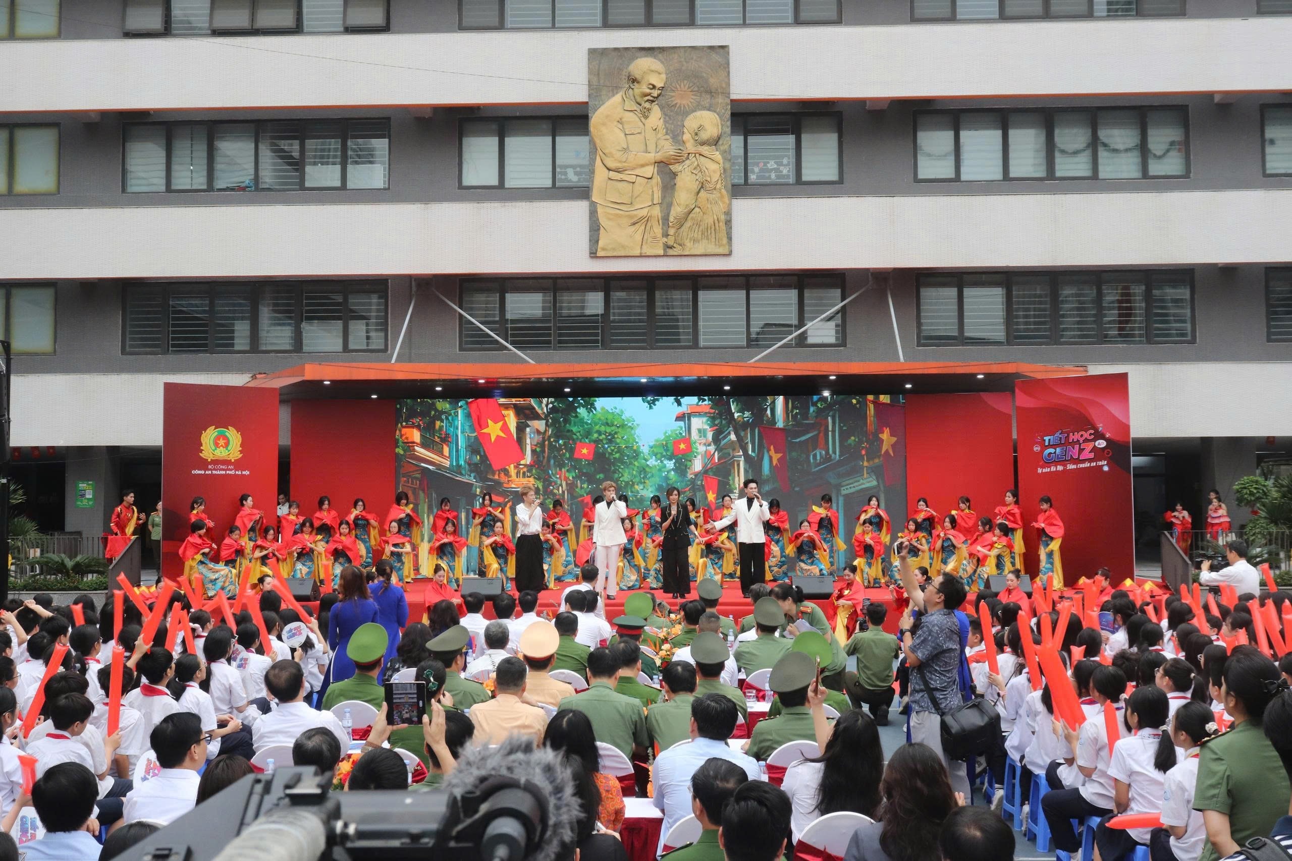 Đông đảo học sinh tham gia chương trình Cầu truyền hình đặc biệt mang tên “Tiết học Gen Z - Tự hào Hà Nội, sống chuẩn an toàn” do Công an thành phố Hà Nội chủ trì tại điểm cầu trường THCS Trần Duy Hưng. Ảnh: Đỗ Đạt