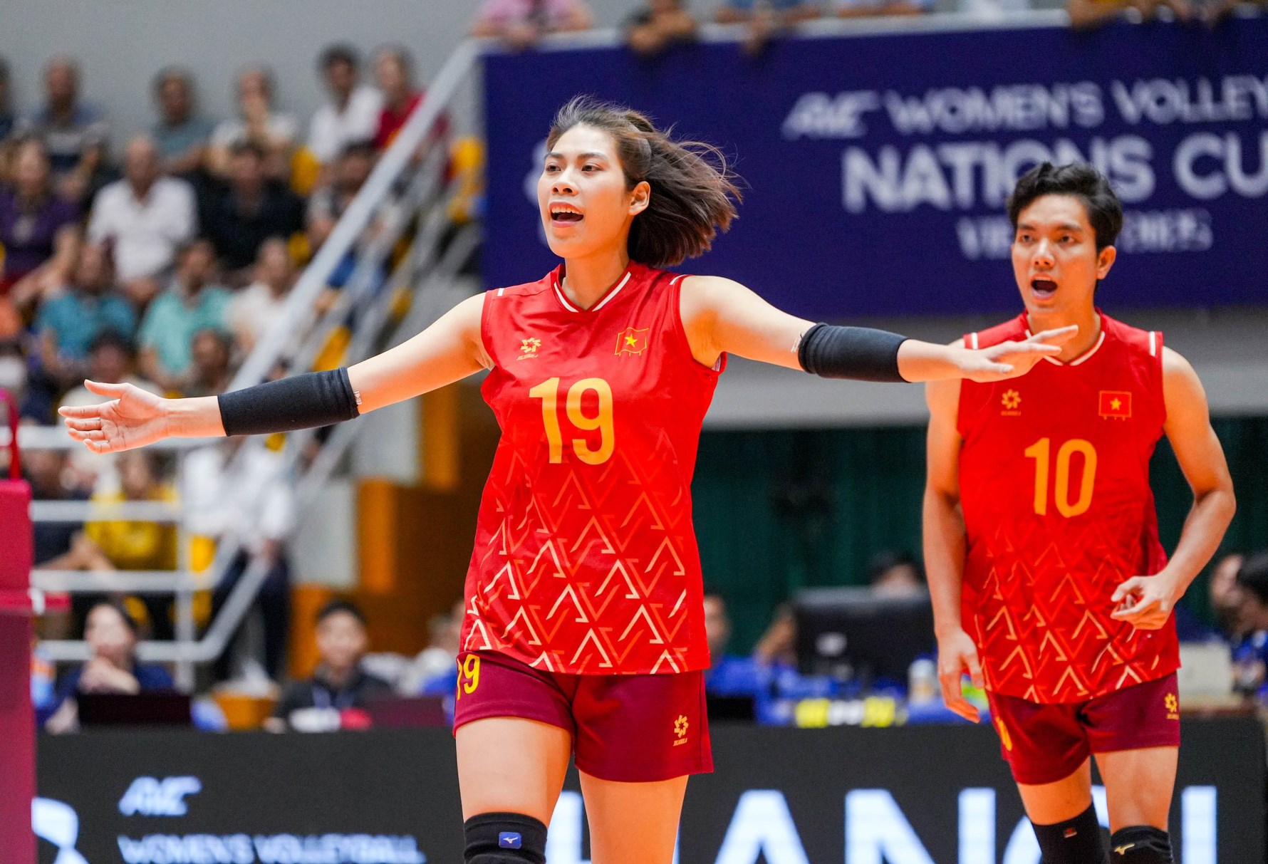 | Đoàn Thị Lâm Oanh (số 19) trong trận đội tuyển bóng chuyền nữ Việt Nam thắng đội Hồng Công (Trung Quốc) 3-0 tại AVC Nations Cup 2025. Ảnh: VFV |