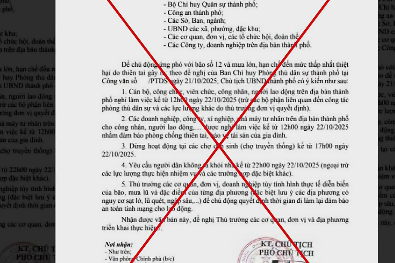 Nội dung giả mạo này nêu về "chủ trương chỉ đạo cho cán bộ, công chức, viên chức nghỉ làm việc, dừng hoạt động các chợ trên địa bàn thành phố từ chiều 22/10 để ứng phó bão số 12".
