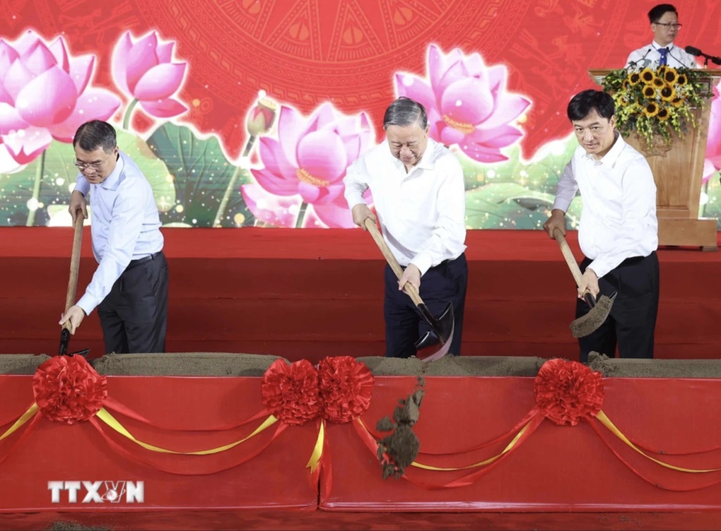 Tổng Bí Thư Tô Lâm và các đại biểu thực hiện nghi thức khởi công Trường liên cấp Tiểu học, Trung học cơ sở xã Si Pa Phìn, tỉnh Điện Biên ngày 27/7/2025. Ảnh: TTXVN