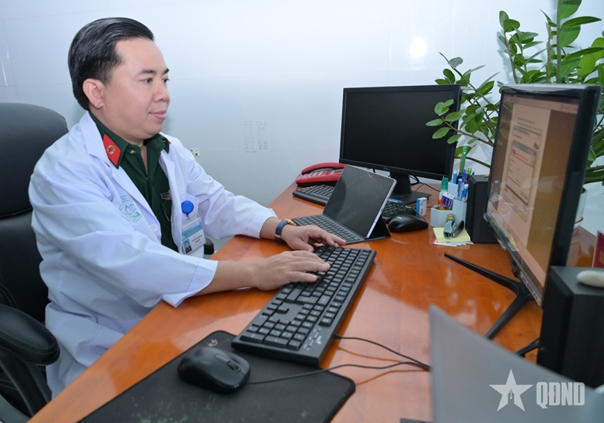 | Đại úy, Bác sĩ chuyên khoa II Dương Quốc Định, Giám đốc Bệnh viện Quân dân y Đồng Tháp xử lý công việc trên máy vi tính. |