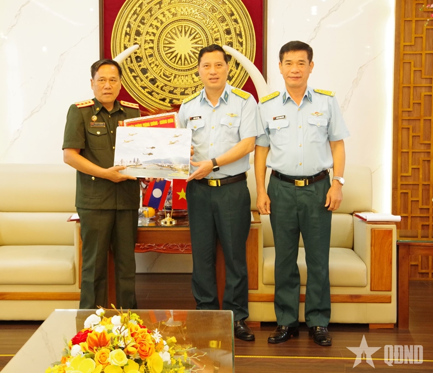 Lãnh đạo Sư đoàn Không quân 372 trao quà lưu niệm tặng Đại tá Saysana SaLermsack, Phó cục trưởng Cục Tuyên huấn, Tổng cục Chính trị QĐND Lào. |