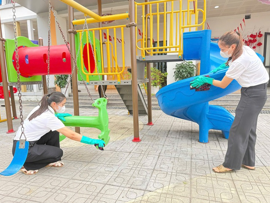 | Vệ sinh đồ chơi tại các trường mầm non ở Hà Nội. |