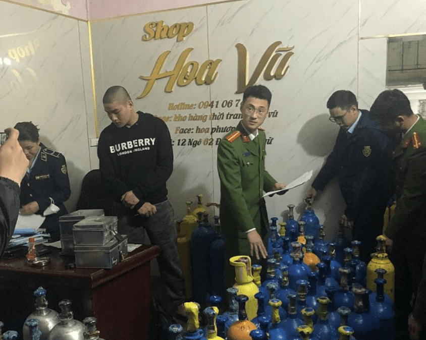 Lực lượng chức năng đã phát hiện và triệt phá kho bình khí cười lớn vào ngày 2/2 với 239 bình khí cười các loại không có nguồn gốc xuất xứ.