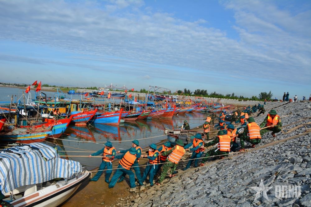 Các lực lượng chức năng giúp người dân neo đậu tàu thuyền tại Cảng cá Xuân Hội (xã Đan Hải, tỉnh Hà Tĩnh) trong bão số 5 vừa qua. |