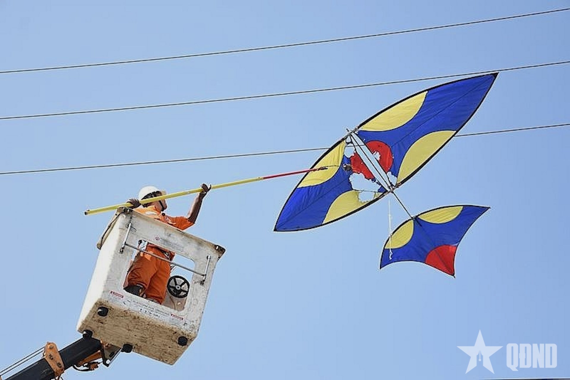 | Công nhân điện lực gỡ diều vướng trên đường dây điện. |