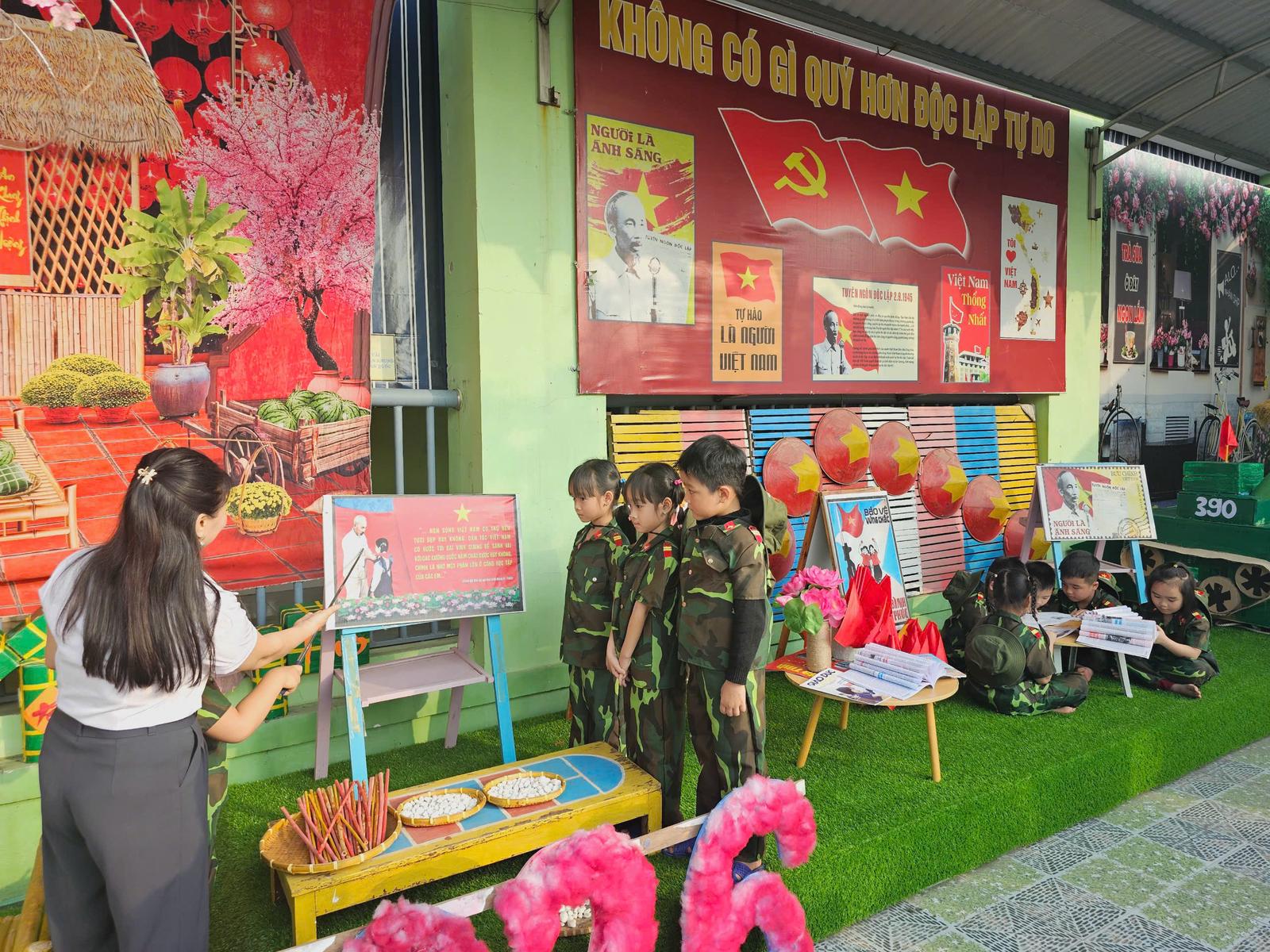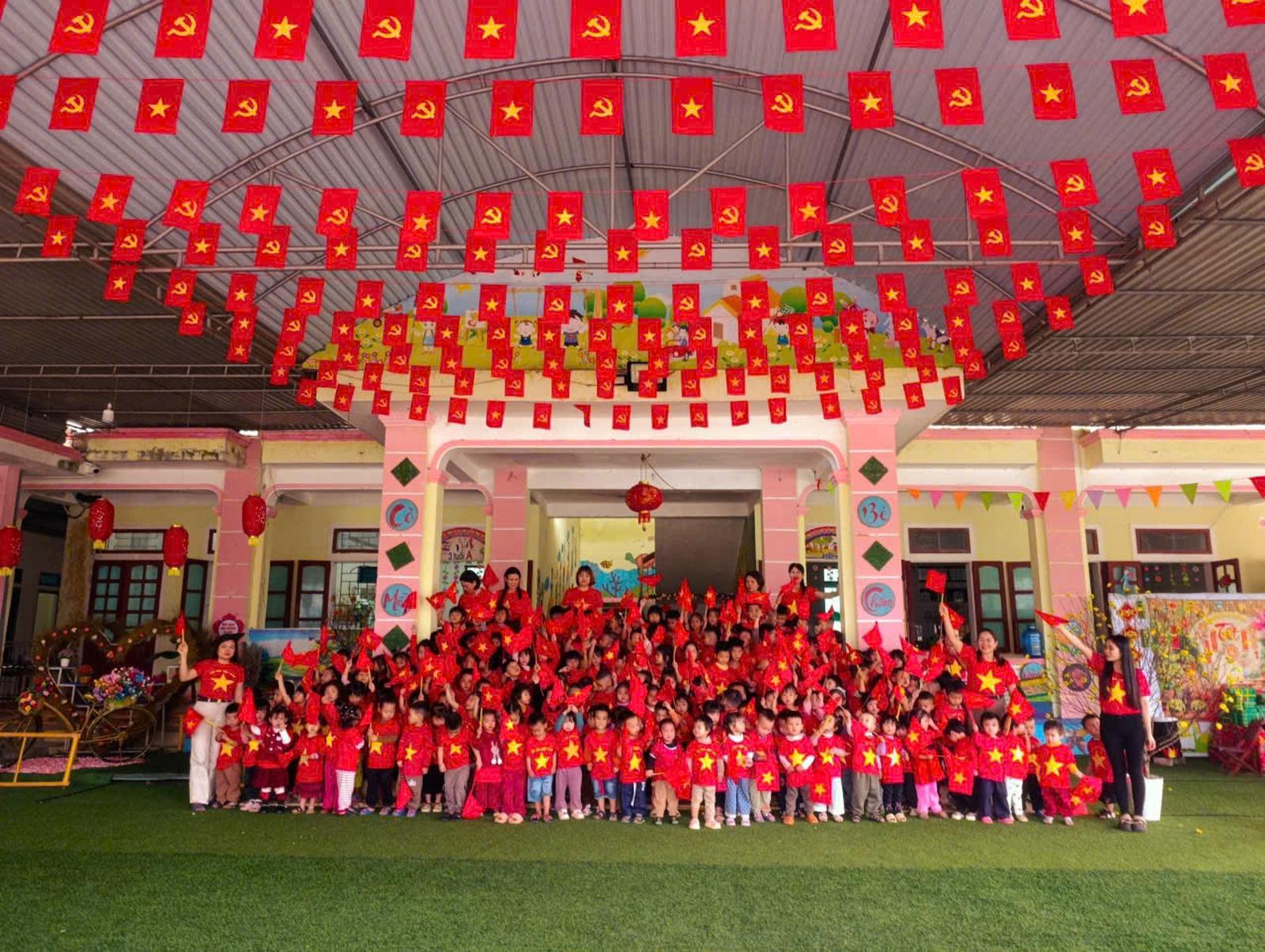 Cô và trò Trường Mầm non Cẩm Hưng hướng về Đại hội XIV . Ảnh: NT