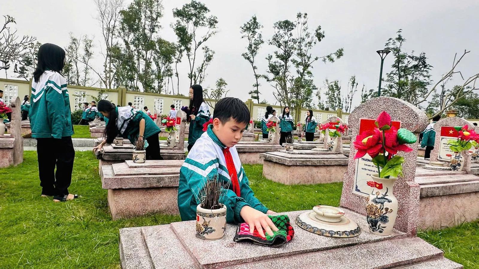 Đặc biệt, nhiều trường tổ chức các hoạt động “đền ơn đáp nghĩa”, chăm sóc, tri ân các anh hùng liệt sĩ. Tiêu biểu, Trường THCS Đại Nài (phường Thành Sen) đã huy động cán bộ, giáo viên và hơn 900 học sinh tham gia tổng vệ sinh, dâng hương, chăm sóc các phần mộ liệt sĩ tại Nghĩa trang Liệt sĩ Núi Nài.