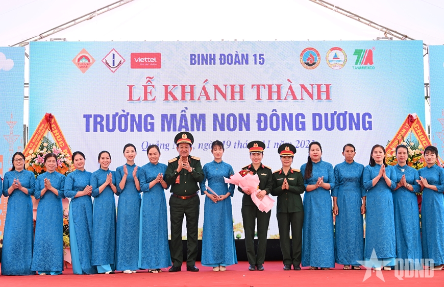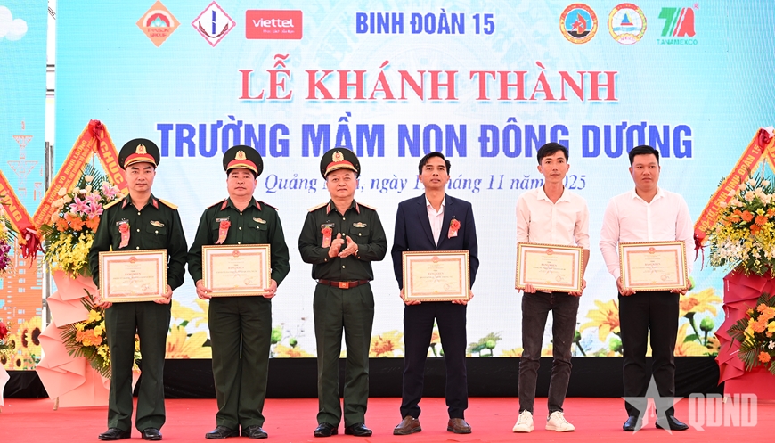 Thiếu tướng Hoàng Văn Sỹ, Tư lệnh Binh đoàn 15 trao bằng khen tặng các tập thể có thành tích trong thiết kế, thi công công trình Trường Mầm non Đông Dương.