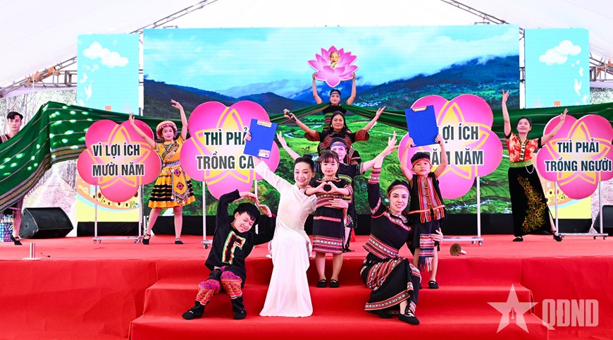 Tiết mục văn nghệ của cô, trò Trường Mầm non Đông Dương chào mừng lễ khánh thành trường.