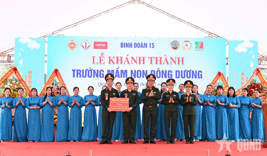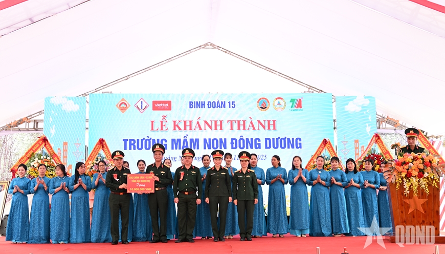 Cục Chính sách - Xã hội (Tổng cục Chính trị Quân đội nhân dân Việt Nam) trao quà tặng Trường Mầm non Đông Dương.