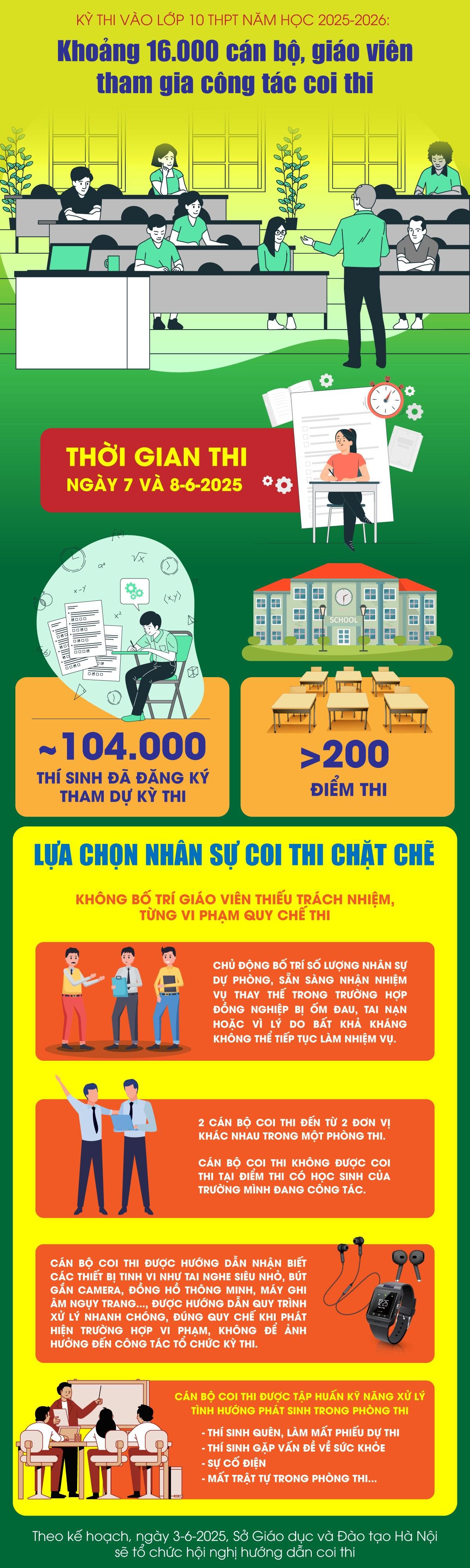 Trong hai ngày 7 và 8-6-2025, Hà Nội sẽ diễn ra kỳ thi tuyển sinh vào lớp 10 THPT công lập năm học 2025-2026 với sự tham gia của gần 104.000 thí sinh. Với quy mô lớn, tính chất cạnh tranh cao, Sở Giáo dục và Đào tạo Hà Nội dự kiến điều động khoảng 16.000 cán bộ, giáo viên tham gia công tác coi thi tại hơn 200 điểm thi.