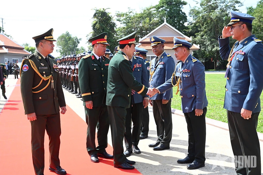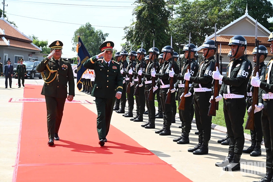 Đại tướng Phan Văn Giang và Đại tướng Tea Seiha duyệt Đội danh dự tại Bộ tư lệnh Hiến binh tỉnh Svay Rieng.