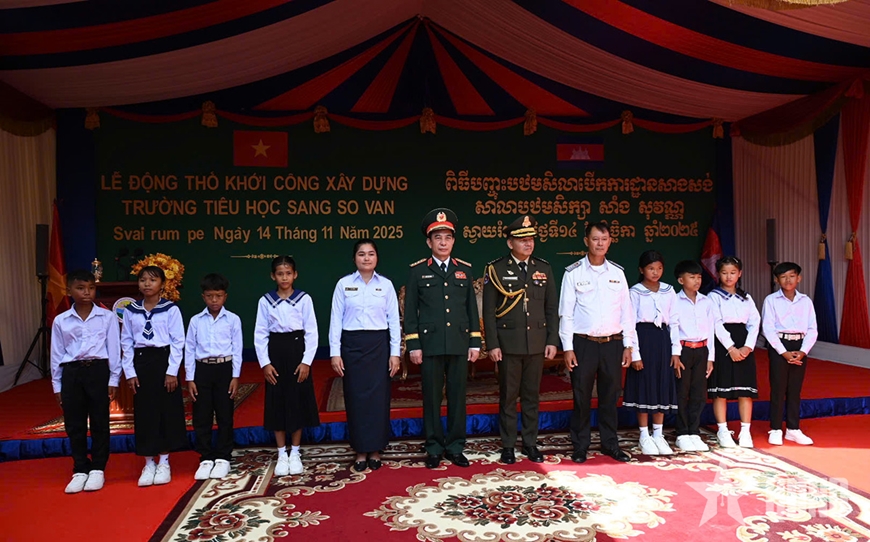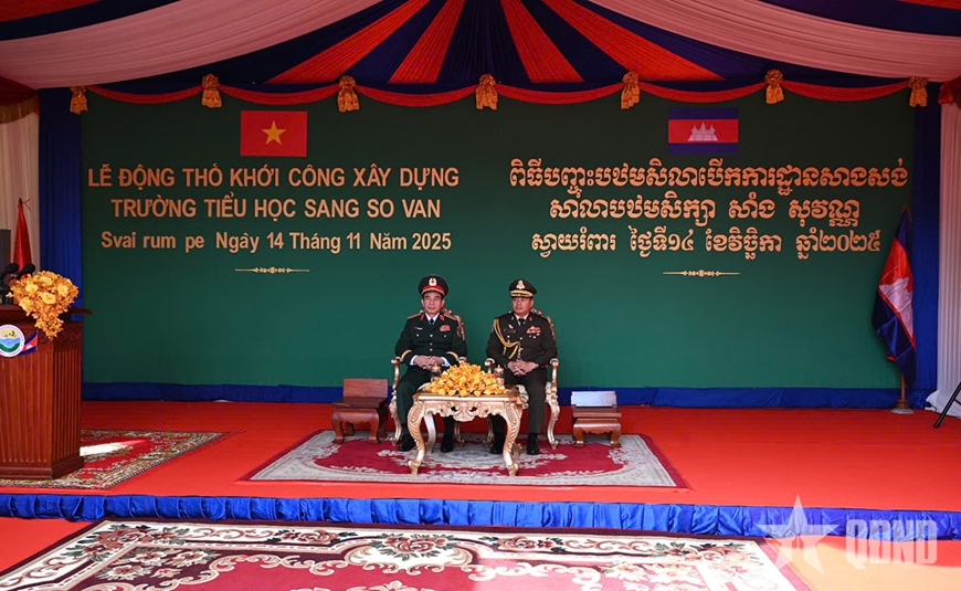 Trong khuôn khổ Giao lưu hữu nghị quốc phòng biên giới Việt Nam - Campuchia lần thứ hai, sáng 14-11, đoàn đại biểu hai nước đã dự Lễ khởi công xây dựng công trình hữu nghị Trường Tiểu học Sang Sovan tại huyện Svay Teap, tỉnh Svay Rieng.