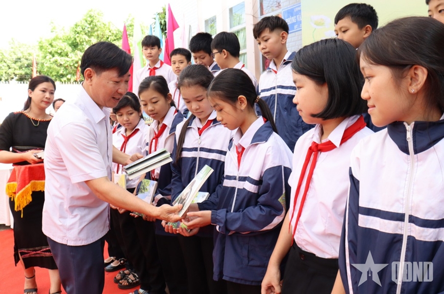 Đại diện Nhà xuất bản Hội Nhà văn và chính quyền địa phương trao sách văn học tặng các em thiếu nhi tại tỉnh Đắk Lắk. Ảnh: TUẤN LINH |