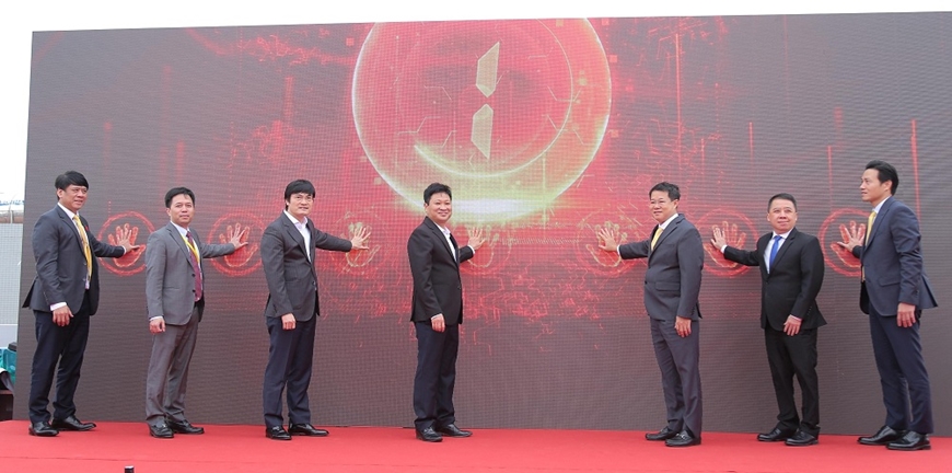 Lãnh đạo các cấp, ngành thực hiện nút khởi động triển khai thiết bị bay không người lái vận chuyển trong y tế. Ảnh: TRẦN ANH |