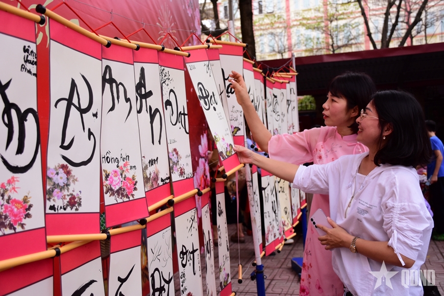 | Giáo viên xem các tác phẩm của học sinh trong phần thi viết thư pháp. |