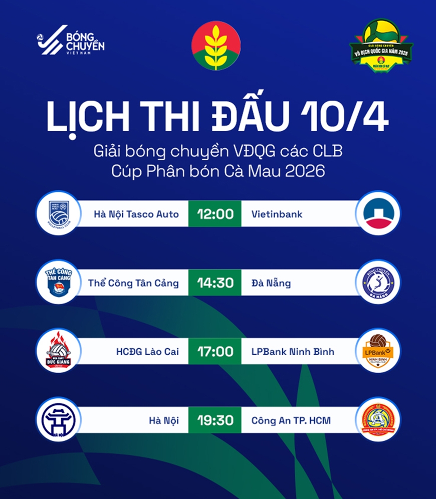 Theo lịch thi đấu bóng chuyền ngày 10-4, Hà Nội Tasco Auto đối đầu với Ngân hàng Công thương vào lúc 12 giờ. Cũng tại bảng nữ, Hóa chất Đức Giang Lào Cai chạm trán LPBank Ninh Bình vào lúc 17 giờ.