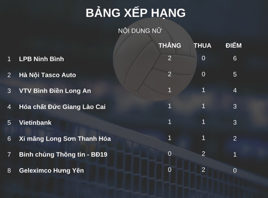 Tại bảng nữ, đương kim vô địch VTV Bình Điền Long An bất ngờ thua Xi măng Long Sơn Thanh Hóa với tỷ số 2-3. Sau 2 lượt trận, LPBank Ninh Bình tạm dẫn đầu với 6 điểm; tân binh Hà Nội Tasco Auto bất ngờ xếp nhì với 5 điểm. Ứng viên vô địch Binh chủng Thông tin – Binh đoàn 19 xếp áp chót với vỏn vẹn 1 điểm.