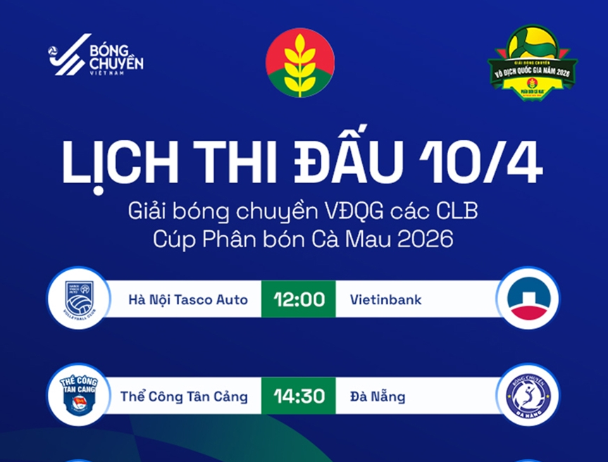 Cập nhật lịch thi đấu bóng chuyền ngày 10-4 với tâm điểm các trận đấu lượt trận thứ 3 Giải bóng chuyền vô địch quốc gia các câu lạc bộ năm 2026.