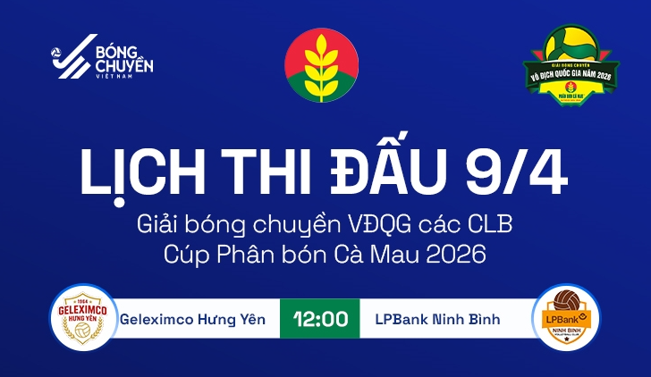 Cập nhật lịch thi đấu bóng chuyền hôm nay (ngày 9-4) với tâm điểm là các trận đấu thuộc vòng 1 Giải bóng chuyền vô địch quốc gia các câu lạc bộ năm 2026.