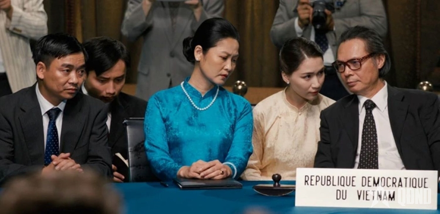 | Hòa Minzy (thứ 2 từ phải sang) hóa thân vai nữ trợ lý của đoàn Việt Nam Dân chủ cộng hòa tại Hội nghị Paris năm 1972 trong phim "Mưa đỏ". |