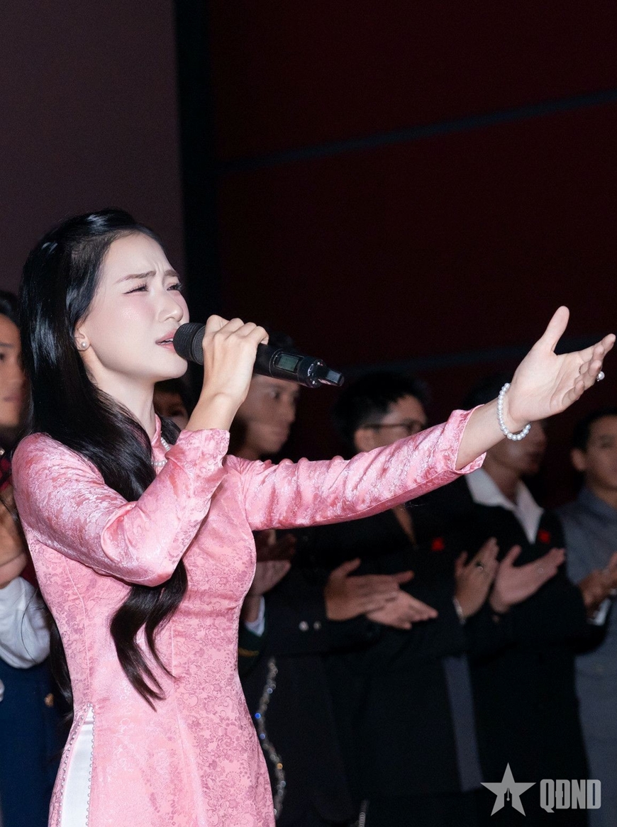 | Nữ ca sĩ hát mộc bài "Nỗi đau giữa hòa bình" sau khi kết thúc bộ phim khiến khán giả xúc động. |