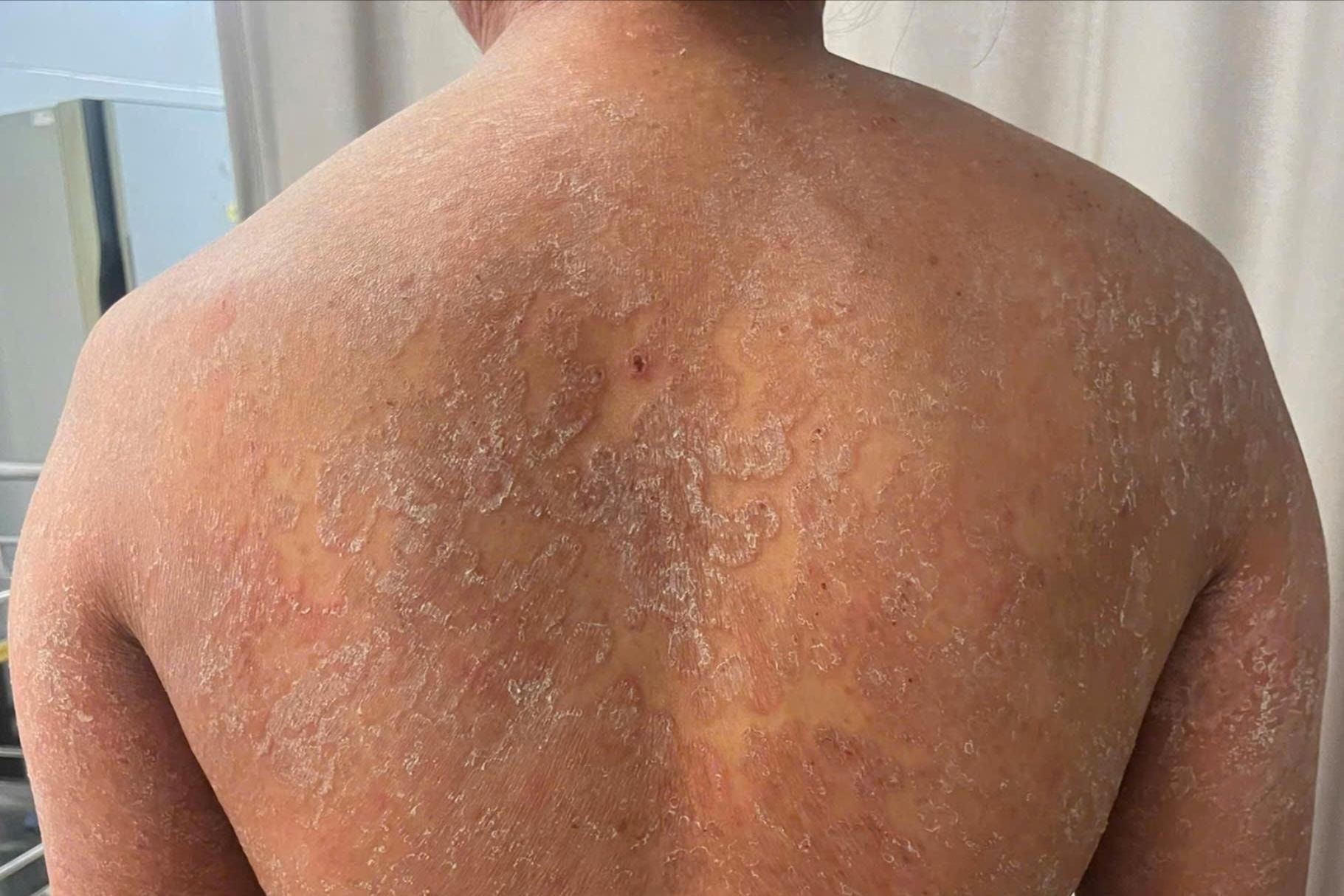 Tổn thương da lan rộng toàn thân sau 2 năm bệnh nhân tự ý sử dụng thuốc bôi để điều trị. Ảnh: BVCC