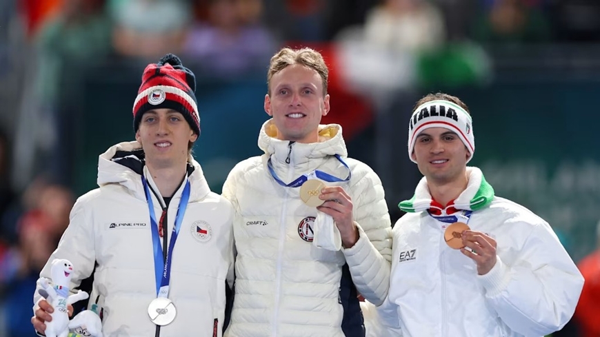 | Sander Eitrem (giữa) nhận huy chương vàng nội dung trượt băng tốc độ 5.000m nam, thiết lập kỷ lục Olympic mới. Ảnh: olympics.com |