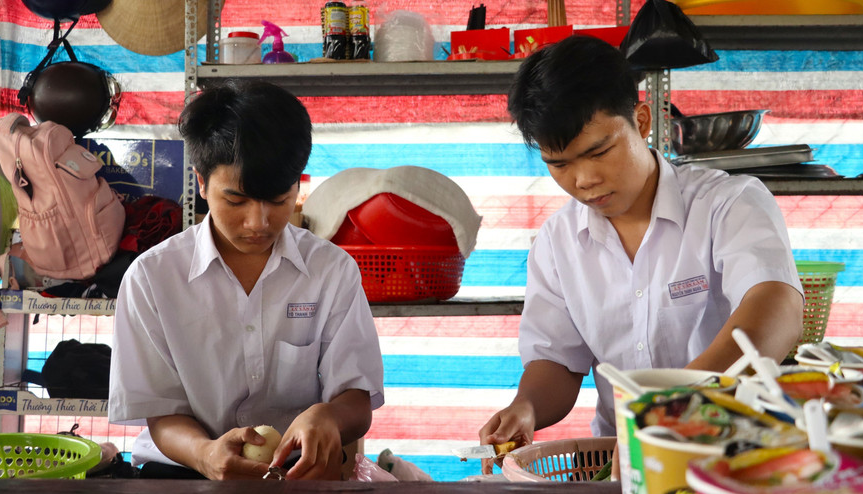 Nguyễn Thành Nghĩa và Tô Thành Tiến làm việc tại căng-tin trường.