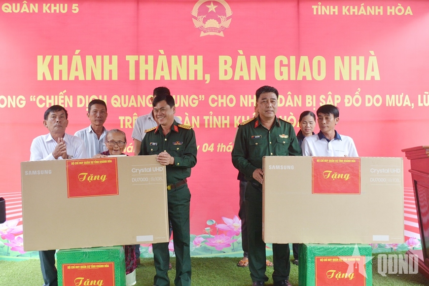Lãnh đạo Bộ CHQS tỉnh Khánh Hòa trao ti vi tặng các gia đình.
